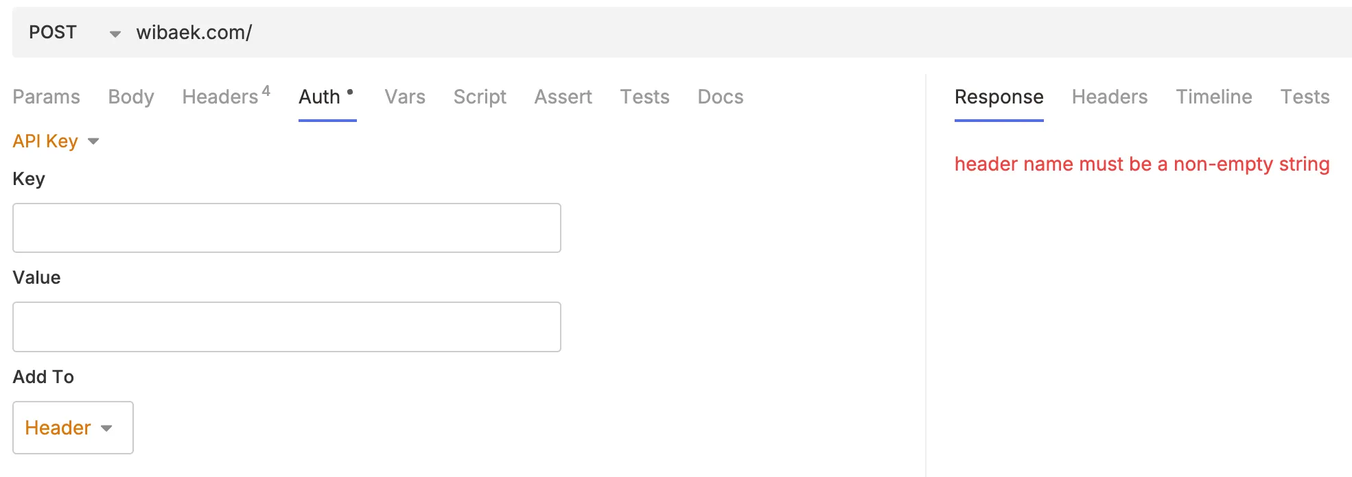 즉, key가 비어 있는 인증 정보(auth:apikey)가 존재하면, 내부적으로 이를 헤더로 강제 주입하면서 문제가 발생하는 것이다.